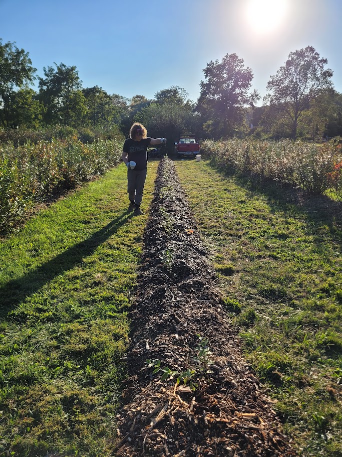 - Mulching with Organic Matter: Mulching is one of the most impactful regenerative techniques we use here at Hundred Fruit Farm. To be clear, mulching doesn’t mean putting down ornamental dyed mulch like you see in ornamental landscaping. It means using any organic material to cover the soil surface. The benefits are numerous – retaining soil moisture (and thus reducing the need to water plants), moderating soil temperature swings, suppressing weeds, increasing soil organic matter, and even providing nutrients for our plants. So while conventional farms might use herbicide, and large organic farms might use black plastic, we use a prodigious amount of wood chips every year on our berry rows, fruit trees, nut trees, garden pathways, and edible landscaping beds. The wood chips we use are from arborists who do tree trimming in the area and need to find places to dump the chips at. So it’s a win-win for us and the arborists. We get great mulch, and they get a convenient place to dump their chips so they can get back to more trimming.